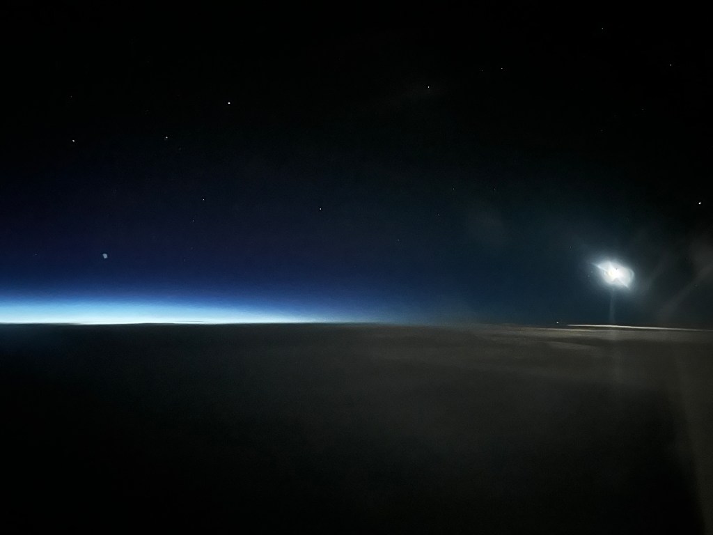 Carrera de despegue normal, dentro de lo que es despegar de noche en este aeropuerto, e inmediatamente rumbo al este. Y aquí estamos, horas después, en el meridiano 34 oeste. Llevamos a oscuras desde que se puso el Sol hace horas, pero acaba de despuntar un triangulo blanco frente a nosotros. Ha ido creciendo rápidamente y ahí está, a unos tres dedos sobre el horizonte de unas nubes que ilumina, la Luna. No está llena, tan solo se ve un cuarto decreciente, pero siempre es hermosa.