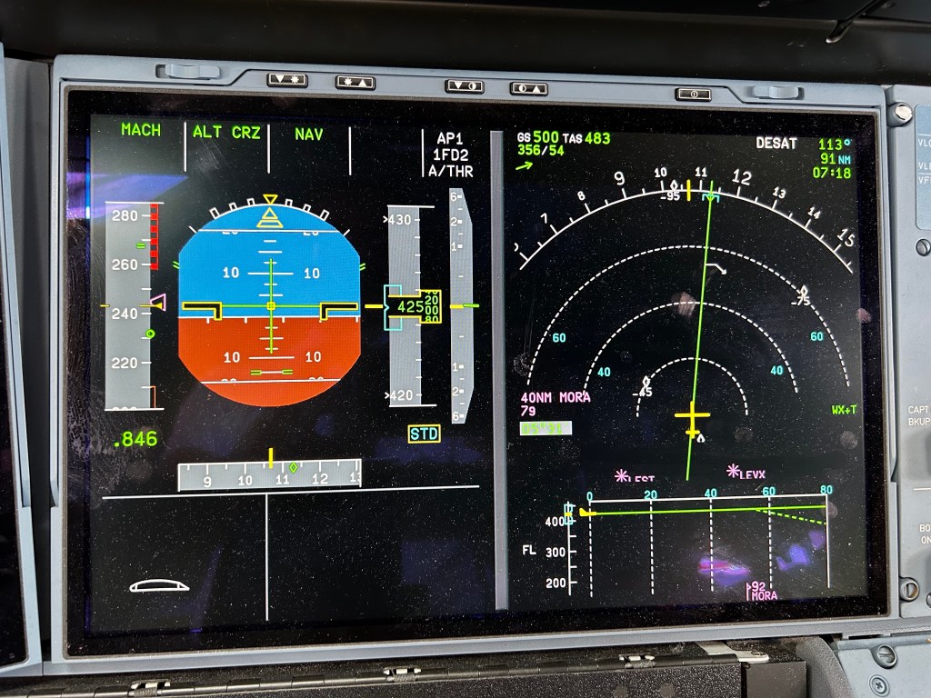 Y a la vez, por la izquierda del avión, se empieza a vislumbrar la línea del horizonte, no falta mucho para que amanezca. Y todo esto ocurre mientras ustedes, en su gran mayoría, duermen. El radar nos muestra muchas nubes pero están todas por debajo del avión, así que no nos afectarán. Nos quedan 2 horas y 40 minutos para aterrizar, casi como un vuelo a Canarias. Estos vuelos cortos a veces se sienten mucho más cortos de lo que realmente son, pero la sensación de satisfacción al formar parte de estos, sus vuelos, es algo incomparable e irrepetible.