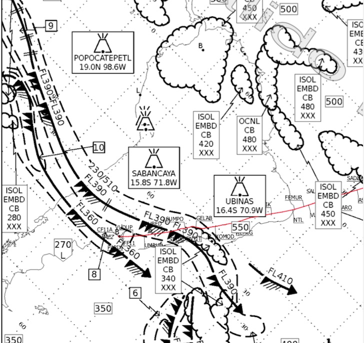5536 millas entre los dos aeropuertos, 13 horas y diez minutos y no nos hemos movido casi nada en todo el vuelo. La única zona donde es posible que nos movamos es entre Rio, São Paulo y el destino. Hay tres grandes chorros de aire que vienen desde el Pacífico y cruzan todo el continente que casi seguro tendrán algo de turbulencia asociada. Vamos a ascender todo lo que podamos para cruzar esa zona lo más alejado posible, pero inevitablemente tendremos que sufrir algo de meneo en el descenso a Ezeiza. Como siempre, haremos todo lo posible para minimizarlo.