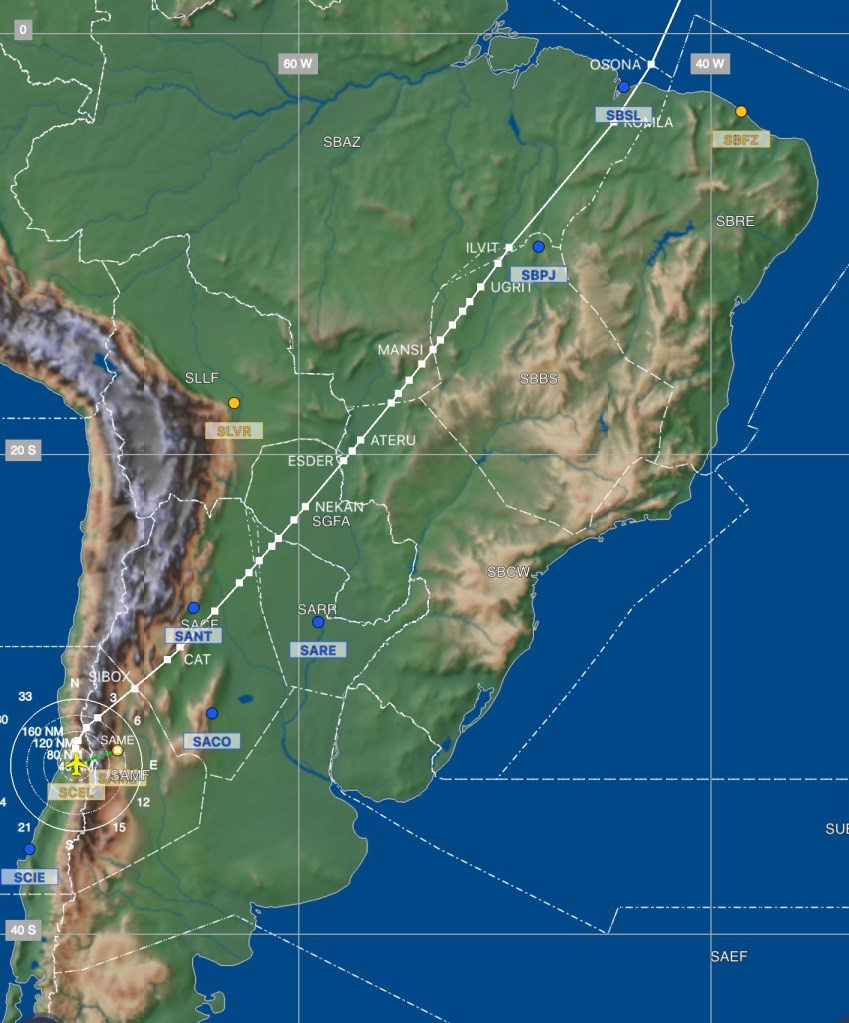 Nosotros aquí seguimos en este “lento” A350 a punto de cruzar el Ecuador al norte de Maranaho en la costa de Brasil. El Sol sigue su camino hacia el oeste y un par de horas antes de llegar a Chile se pondrá tras la cordillera de los Andes. Quizás la luz de la Luna hoy nos permita ver con detalle la fuerza de esas montañas.