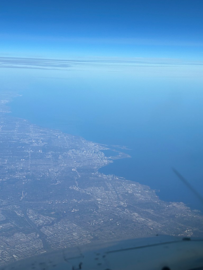 Pudimos ver las avenidas, los barrios de viviendas que rodean el centro de la ciudad, el puerto, el aeropuerto y la costa del lago Ontario. A nuestra derecha incluso vislumbramos durante un breve espacio de tiempo las curvas del rio Niágara y las Cataratas que levantaban esa característica niebla constante alrededor de la zona.