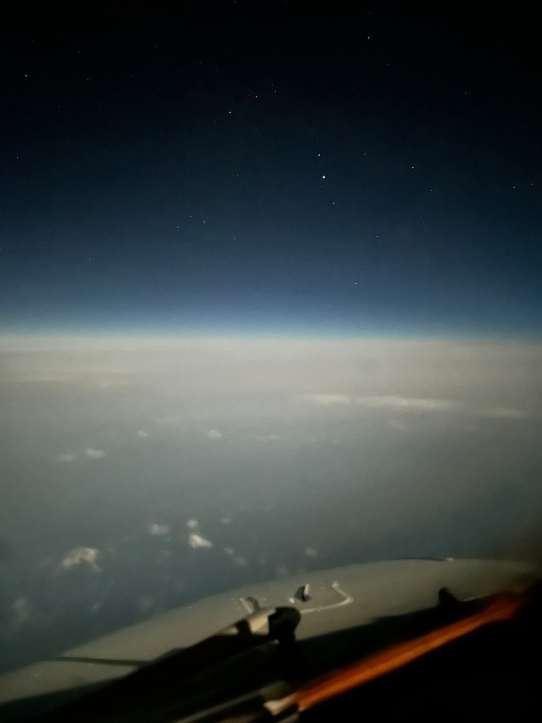Estamos en ese punto mágico del día en el que el sol ya se ha puesto por el oeste y aún queda luz sobre este lado del planeta, una luz grisácea que se acentúa hacia el negro según volamos hacia el este y vemos ya la línea del horizonte a lo lejos que separa el banco de las nubes y el negro del espacio y la noche. Las primeras estrellas ya aparecen a nuestra vista al igual que la luna alta y llena. A veces aparecen unas luces que parecen moverse mientras tintinean y causan cierto revuelo entre los que desconocen de que se trata: son los satélites de las diferentes constelaciones que están en órbitas bajas y reflejan la luz del sol sobre sus paneles hacia nosotros.