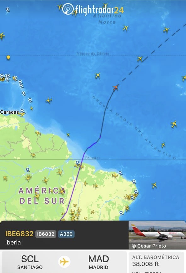 La razón por la que llevamos 9 horas y cuarto a oscuras es porque hemos despegado a las 12 de la noche de Madrid. Cruzamos Portugal para entrar en el Atlántico y sobrevolar Funchal, Maranhao, ahora el Matto Grosso y de aquí seguiremos hacia Paraguay y parte de la inmensa Argentina: Formosa, Salta, Tucumán, Catamarca, La Rioja y finalmente San Juan, desde donde enfrentaremos el cruce de la cordillera mientras comenzaremos el descenso hacia Santiago de Chile.
