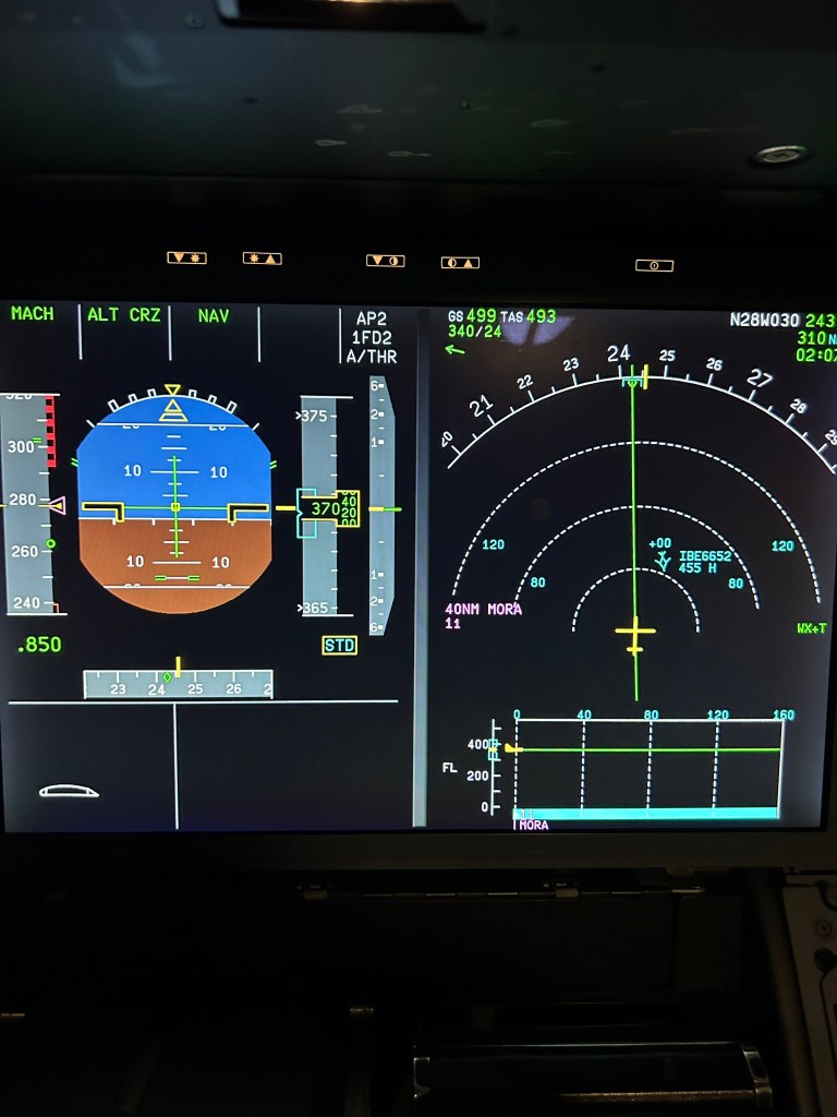 Y todo comenzó cuando entramos en la pista 32L de Barajas. Hoy el vuelo lo realizan los copilotos y Cristian aplicó potencia de despegue (88,4%) para al alcanzar la velocidad de vuelo (162 nudos) elevar este magnífico A350 hacia el vuelo. En cosa de un minuto y unos segundos ya me estaba pidiendo que le subiera el tren de aterrizaje. Y poco a poco, hasta aquí ya hemos llegado.