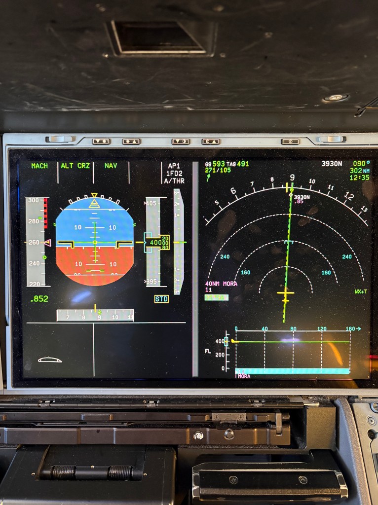 Ahora mismo la calma es total alrededor nuestro y tan solo hay algo ruido, que no es otro que el continuo parloteo de la radio entre controladores y aviones alrededor nuestro. Tras la puerta de cabina sabemos que nuestros compañeros Tcp´s van y vienen a lo largo del avión atendiéndoles a todos ustedes, haciendo que estas primeras horas de la travesía pasen rápidamente y así comenzar el descanso general en el cruce del Atlántico.