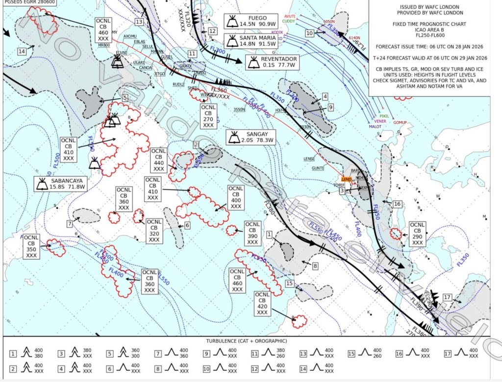 Hoy es un día de los de batir récords ya que, desde mediados del Pacífico y hasta la costa israelí hay un potente chorro de viento en altura casi paralelo al Ecuador. Nuestra ruta va al sur del chorro y lo cierto es que, casi desde que despegamos comenzamos a sentir su influencia, hasta que alcanzamos nivel de crucero donde la media, a lo largo de todo el vuelo, es de 105 nudos de viento en cola.